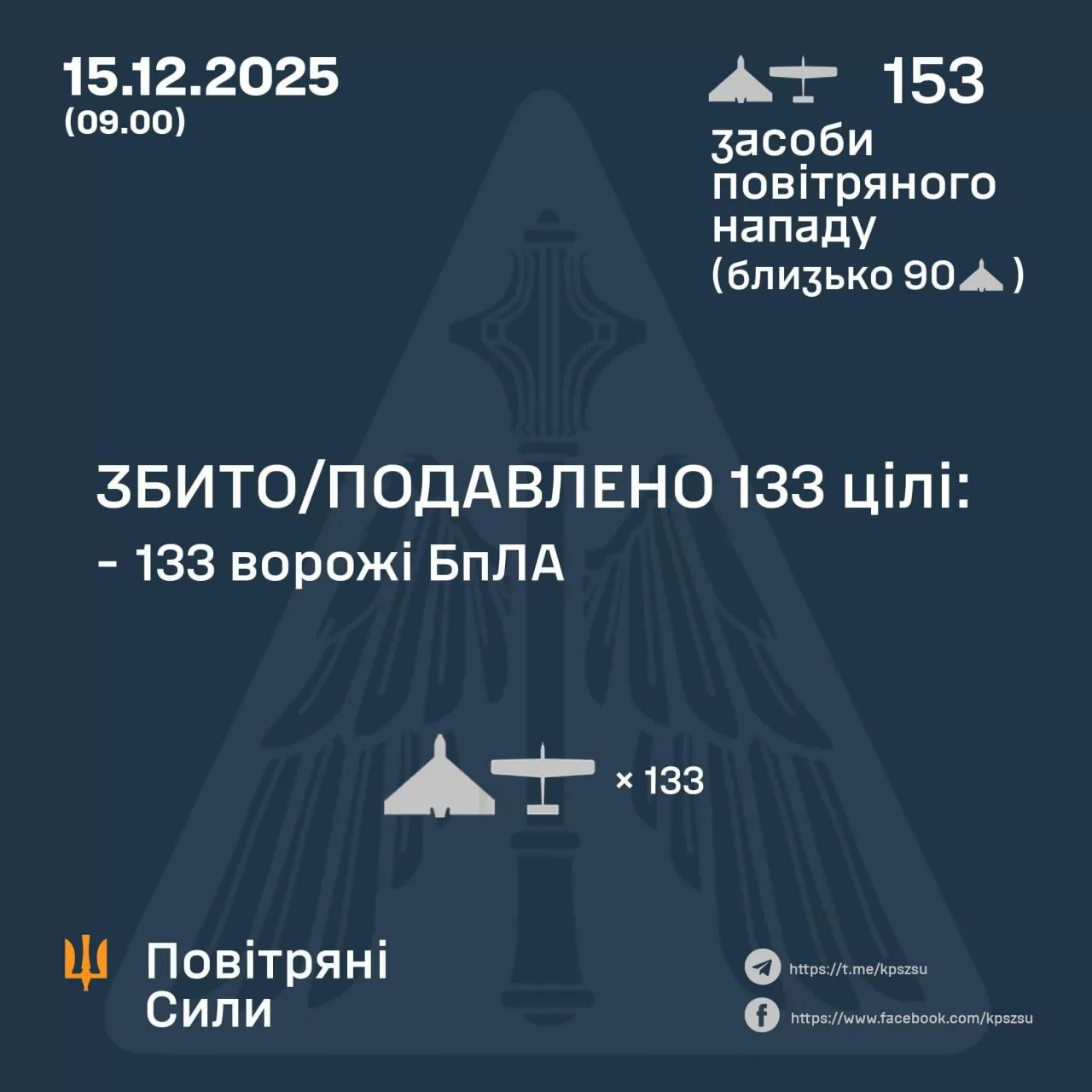 В ночь на 15 декабря, начиная с 18:00 14 декабря, РФ атаковала Украину 153 ударными БпЛА Shahed, «Гербера» и беспилотниками других типов из направлений: Орел, Курск, Приморско-Ахтарск, Миллерово, Шаталово; Чауда, Гвардейское (ВОТ АР Крыма). Около 90 российских дронов были идентифицированы как «шахеды».