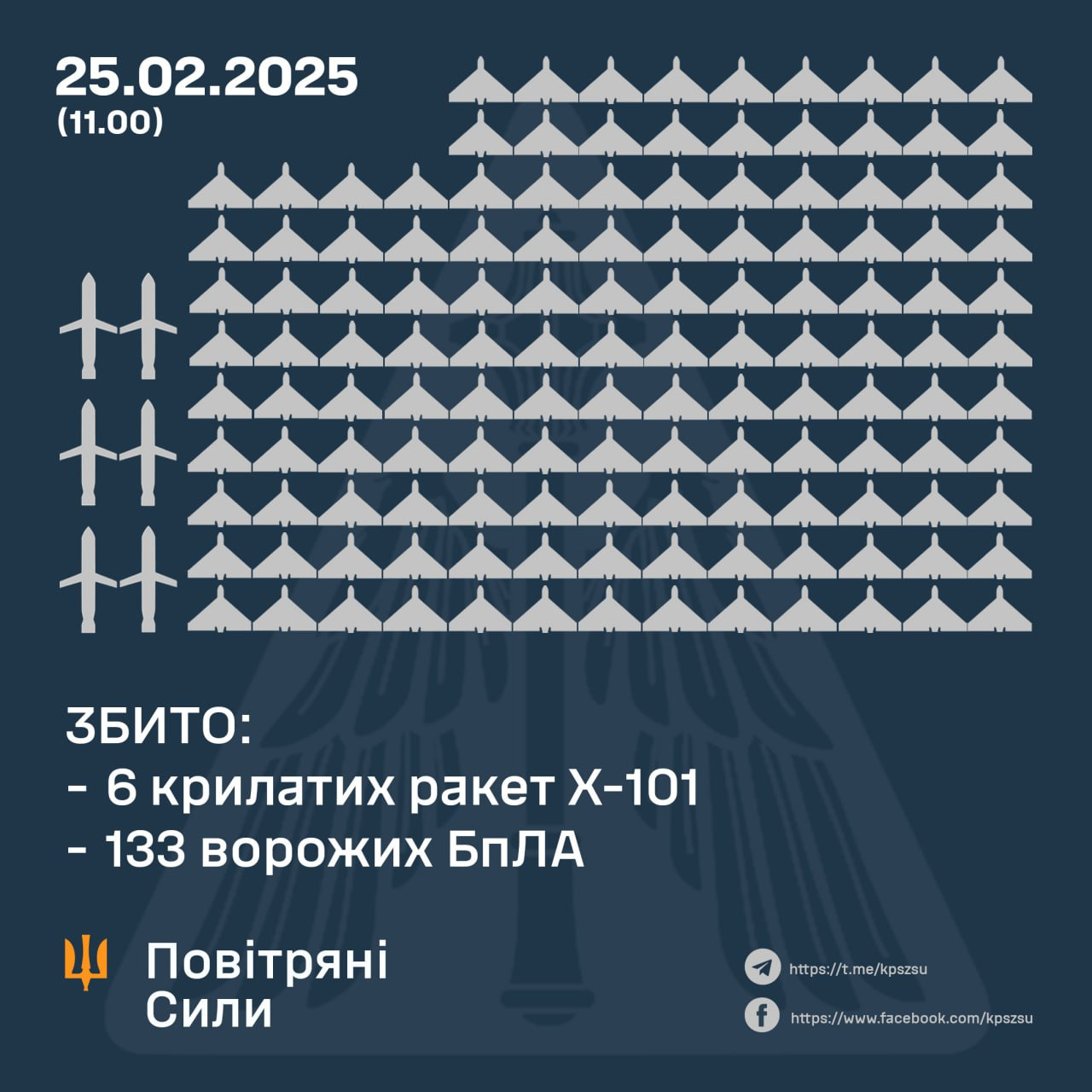 В ночь на 25 февраля, начиная с 19:00 24 февраля, армия РФ атаковала Украину 213 ударными БпЛА Shahed и беспилотниками-имитаторами различных типов с направлений: Орел, Брянск, Курск, Приморско-Ахтарск. Также противник нанес удар семью крылатыми ракетами Х-101 с самолетов стратегической авиации Ту-95 МС.