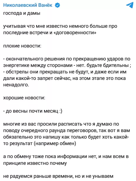 «Похоже, энергетическое перемирие в действии с двух сторон. Посмотрим, как будут выполнять», — написал военный.
