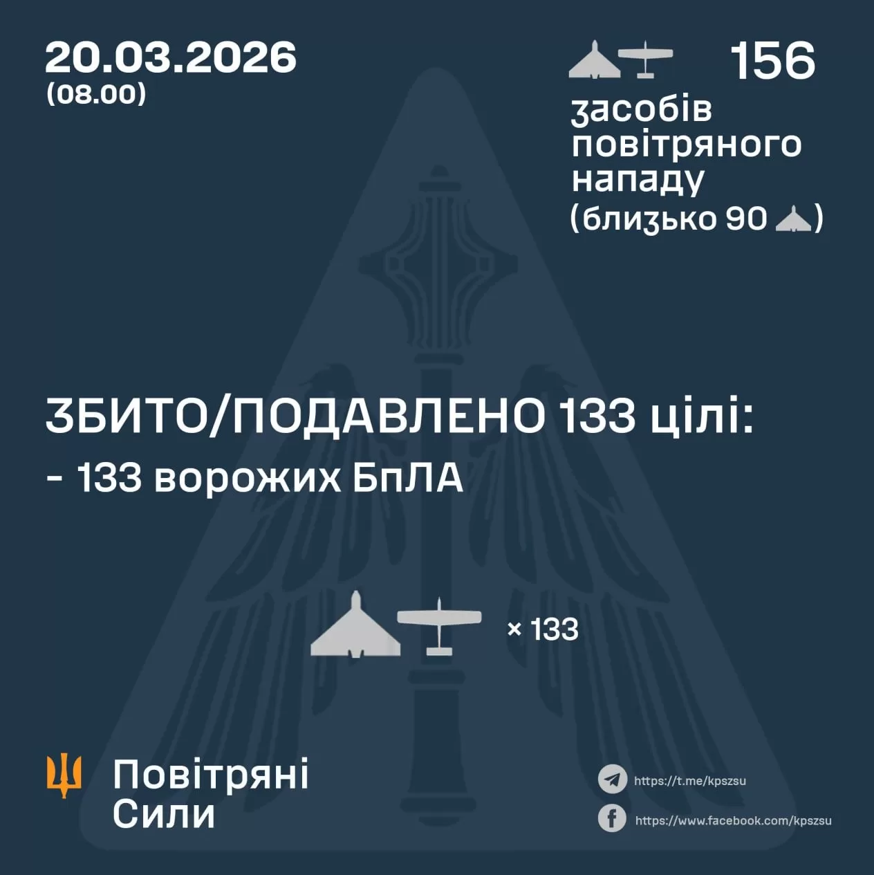 В ночь на 20 марта российские войска атаковали Украину 156 ударными беспилотниками различных типов. Силы противовоздушной обороны сбили или подавили 133 из них.
