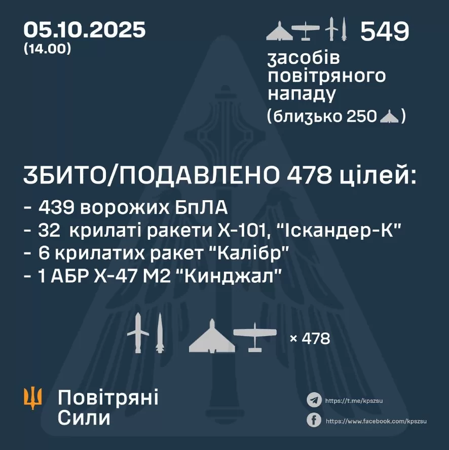 В ночь на 5 октября Россия нанесла масшированный комбинированный удар по территории Украины с применением ударных беспилотников и ракет воздушного, морского и наземного базирования. По данным Воздушных сил ВСУ, всего было зафиксировано 549 воздушных целей, большинство из которых — дроны типа Shahed и Гербера.