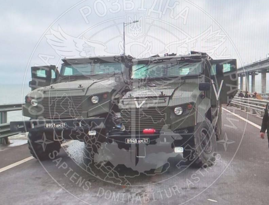 Российские захватчики потеряли пять бронеавтомобилей С-СТЗ «Ахмат» на Крымском мосту в воскресенье, 26 марта.