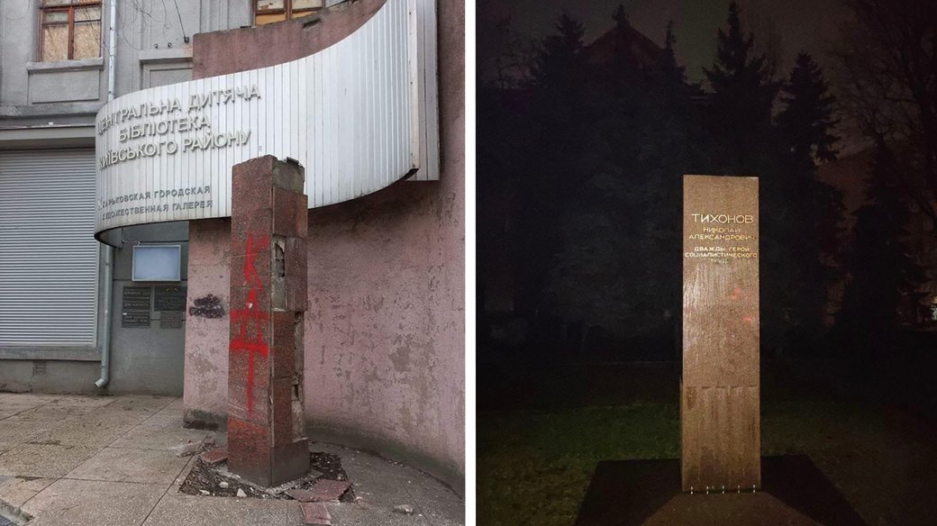 Памятник Островскому стоял возле библиотеки в центре Харькова. Памятник Тихонову – на перекрестке Соборного спуска и улицы Клочковской.