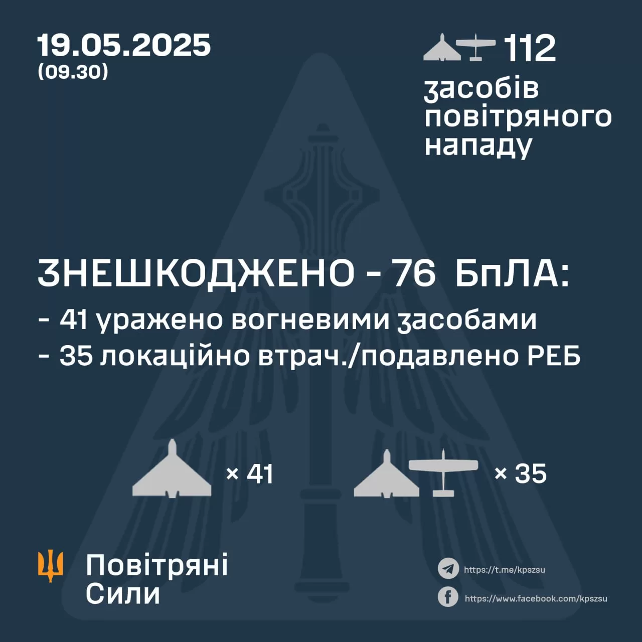 По состоянию на 09.30 противовоздушной обороной обезврежено 76 вражеских БПЛА типа Shahed (беспилотников других типов) на востоке, севере и в центре страны. 41 — сбит огневыми средствами поражения, 35 — локально потеряны/подавлены РЭБ (без негативных последствий).
