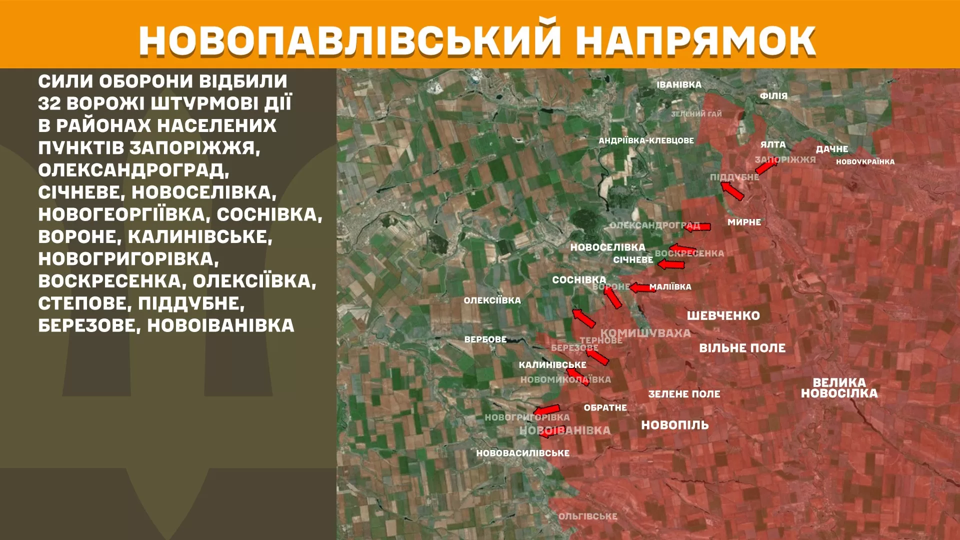 На Новопавловском направлении Силы обороны отразили 32 вражеских штурмовых действия в районах населенных пунктов Запорожье, Александроград, Снежное, Новоселовка, Новогеоргиевка, Сосновка, Вороне, Калиновское, Новогригоровка, Воскресенка, Алексеевка, Степовое, Поддубное, Березовое, Новоивановка.