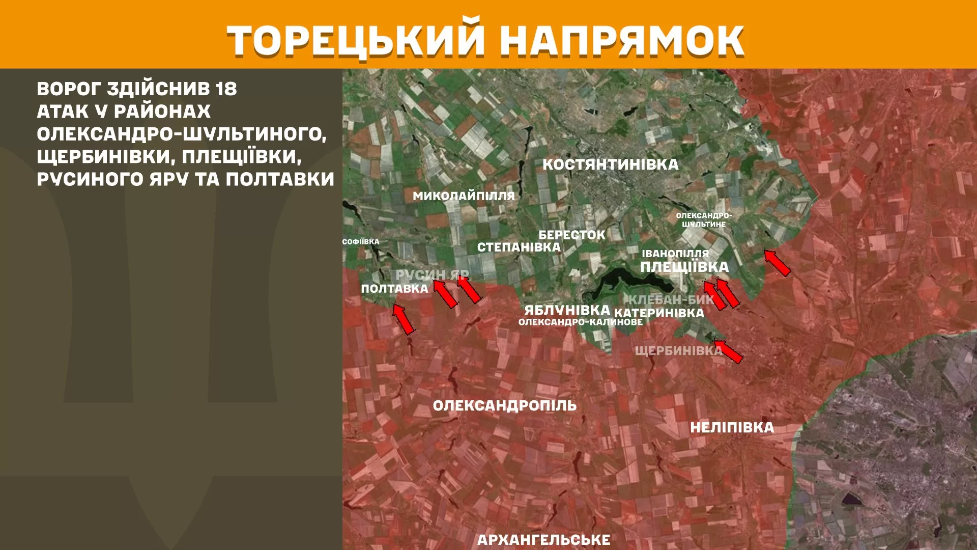 На Торецком направлении враг осуществил 18 атак в районах Александро-Шультиного, Щербиновки, Плещеевки, Русиного Яра и Полтавки.