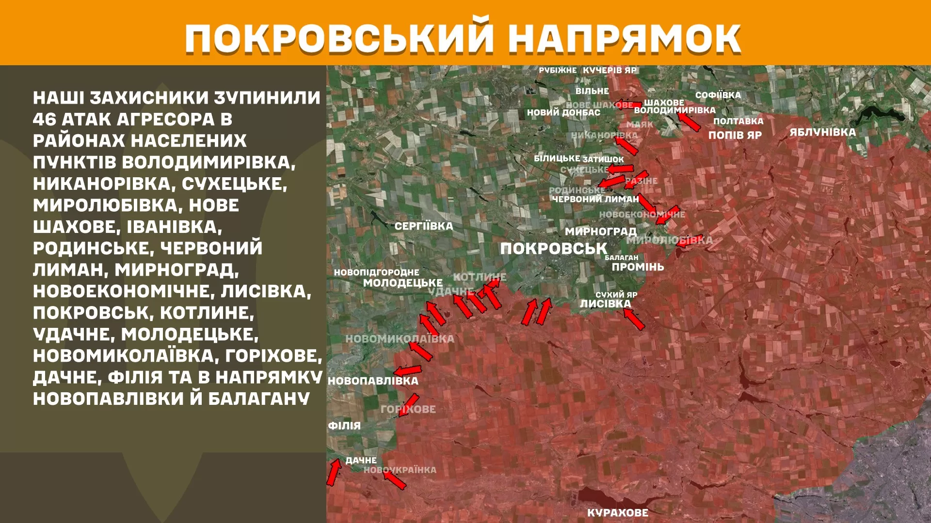 На Покровском направлении украинские защитники остановили 46 атак агрессора в районах населенных пунктов Владимировка, Никаноровка, Сухецкое, Миролюбовка, Новое Шаховое, Ивановка, Родинское, Червоный Лиман, Мирноград, Новоекономичное, Лесовка, Покровск, Котлино, Удачное, Молодецкое, Новониколаевка, Гореховое, Дачное, Филия и в направлении Новопавловки и Балагана.