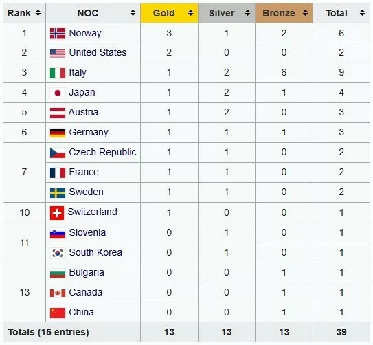 В тройку лидеров медального зачета также входят сборные США с двумя золотыми медалями и Италии, которая имеет одну золотую, две серебряные и шесть бронзовых наград.