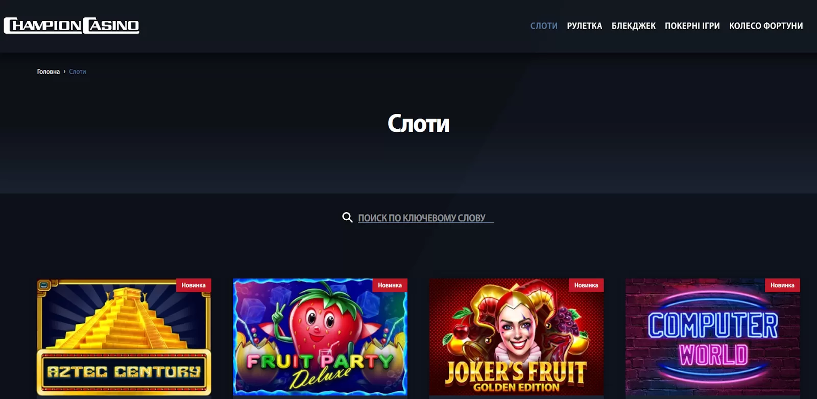 Лайв-казино отсутствует. Категории меню содержат отдельный ассортимент. Классификация по тематикам не производится. Провайдер софта казино один – Champion Studio.