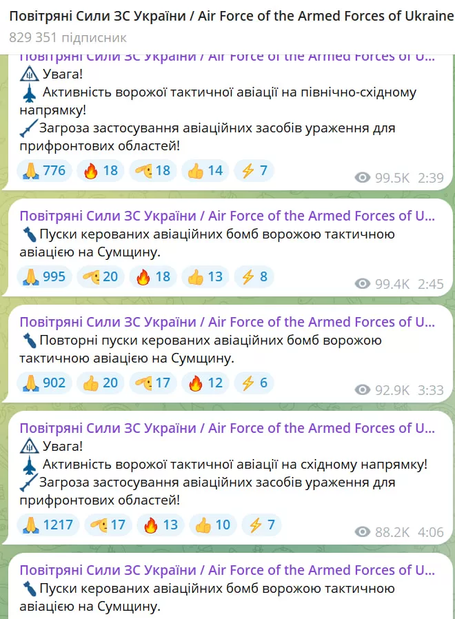 Ночью Воздушные силы ВСУ фиксировали активность тактической вражеской авиации в северо-восточном направлении, а позже – в восточном. В связи с этим в Сумской и Донецкой областях звучала тревога. Также в Сумской области регистрировали пуски КАБов.