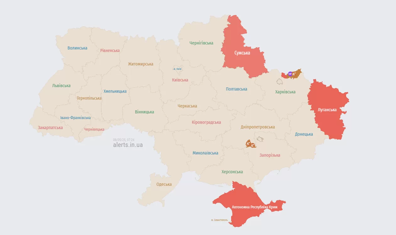 По состоянию на 7 утра тревога продолжается в Сумской и части Харьковской области, существует угроза артобстрела в двух общинах Днепропетровской области.