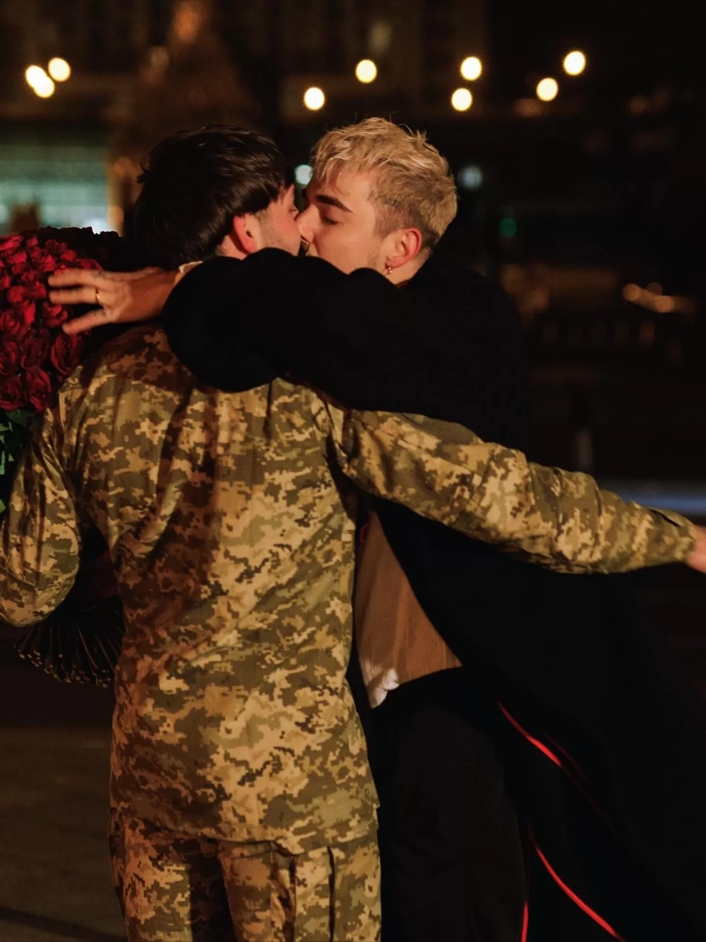 Артист обнародовал и несколько фотографий, на которых мужчина в военной форме делает ему предложение с большим букетом красных роз. На фото видно момент, когда MÉLOVIN принимает предложение.