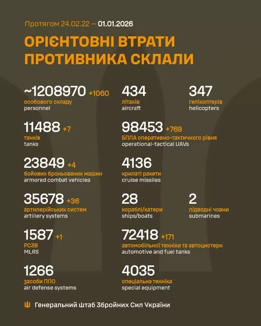 С 31 декабря по 1 января украинская авиация, ракетные войска и артиллерия нанесли удары по районам сосредоточения личного состава, вооружения и военной техники оккупантов. За сутки Россия потеряла в Украине 1060 солдат.