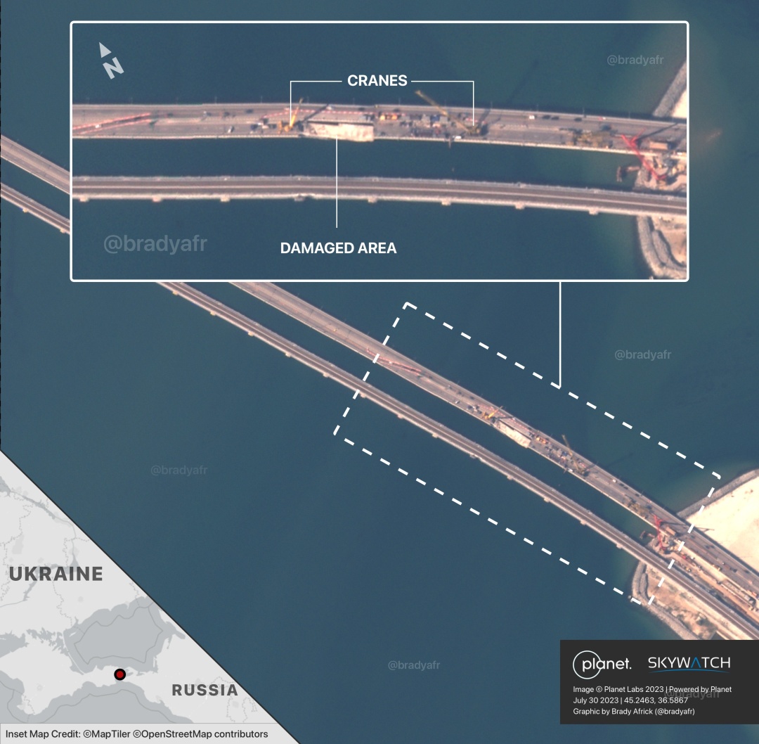 В сети Twitter опубликовали новые спутниковые снимки с Керченского моста, который россияне теперь ремонтируют после его повреждения в результате атаки 17 июля.