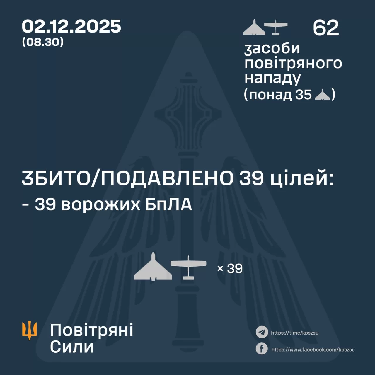 По состоянию на 8:30 противовоздушной обороной сбито и подавлено 39 российских БпЛА различных типов на севере, юге и востоке страны. Зафиксировано попадание 20 ударных БпЛА на восьми локациях.