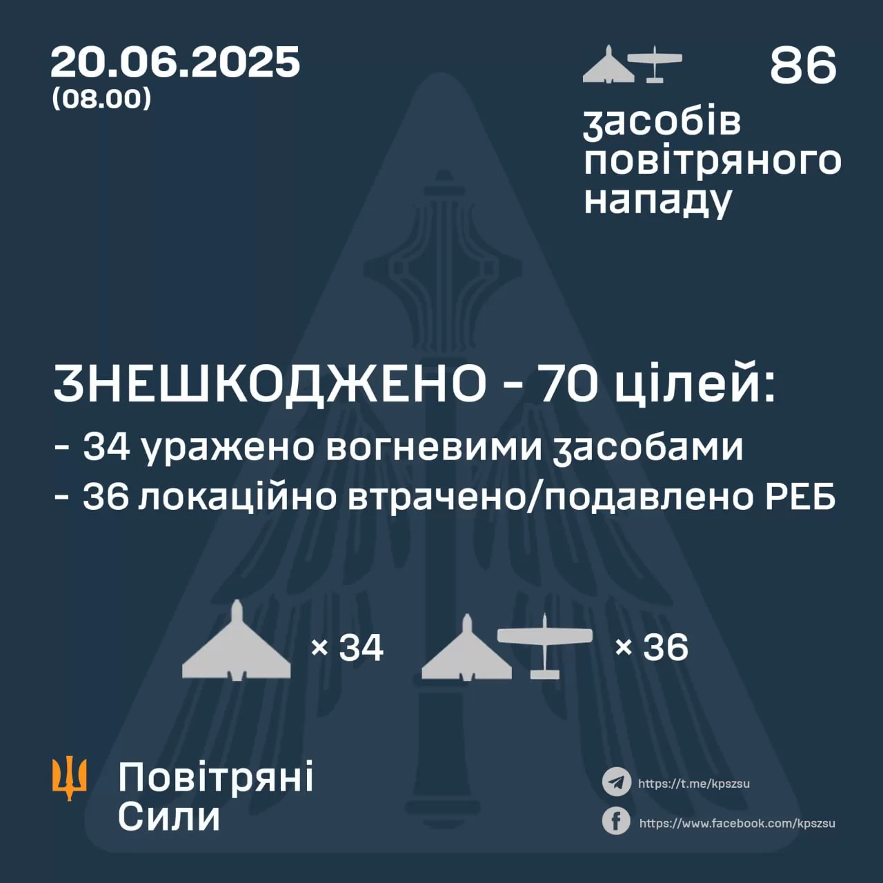 В ночь на 20 июня, начиная с 23:00 19 июня, РФ запустила по Украине 86 ударных БпЛА Shahed и беспилотников-имитаторов различных типов с направлений: Миллерово, Курск, Орел, Брянск, Приморско-Ахтарск; Чауда (ВОТ Крыма).
