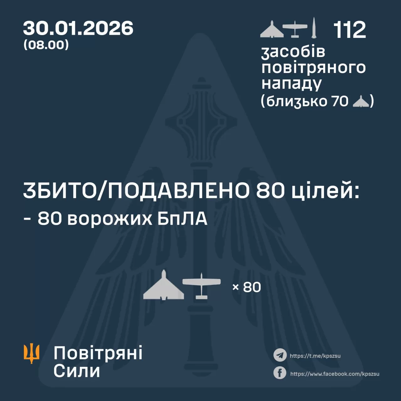 По состоянию на 8:00 противовоздушной обороной сбито и подавлено 80 российских беспилотников.