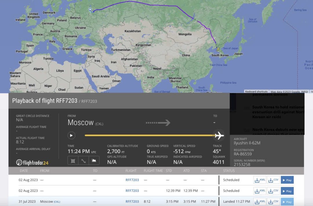 По данным сайта отслеживания полетов Flightradar24, Ил-62М ВВС России с регистрационным номером RA-86559 вылетел из Москвы в Пхеньян 1 августа и прибыл после 8 часов утра по китайскому времени.