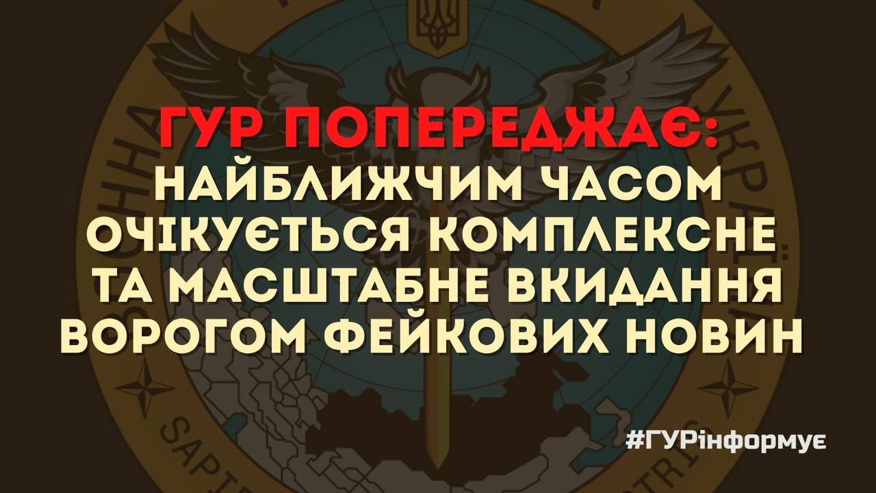 Главное управление разведки Министерства обороны Украины сообщает, что в ближайшее время ожидается комплексный и масштабный вброс врагом фейковых новостей, который будет осуществляться с привлечением всего спектра современных информационных средств и направлен на подрыв доверия к Украине со стороны западных партнеров.