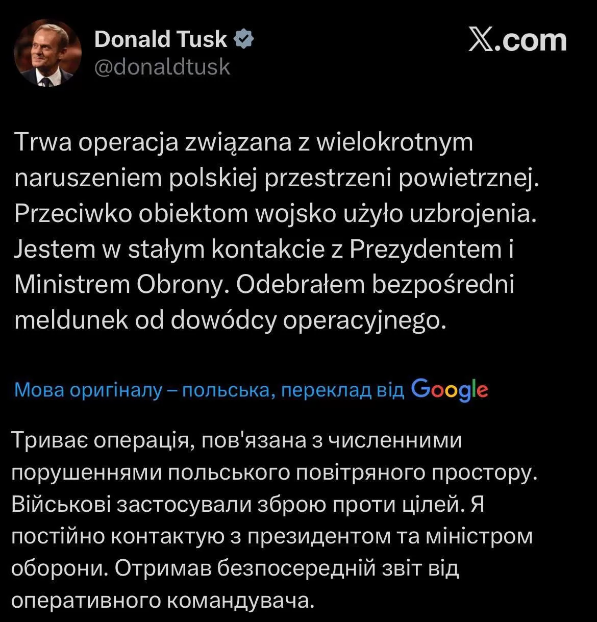 В 00:42 Воздушные силы Украины сообщили о приближении российских ударных БПЛА к польской границе. О движении нескольких групп российских БпЛА на Польшу сообщали и мониторинговые каналы – речь шла о десятке «шахедов».