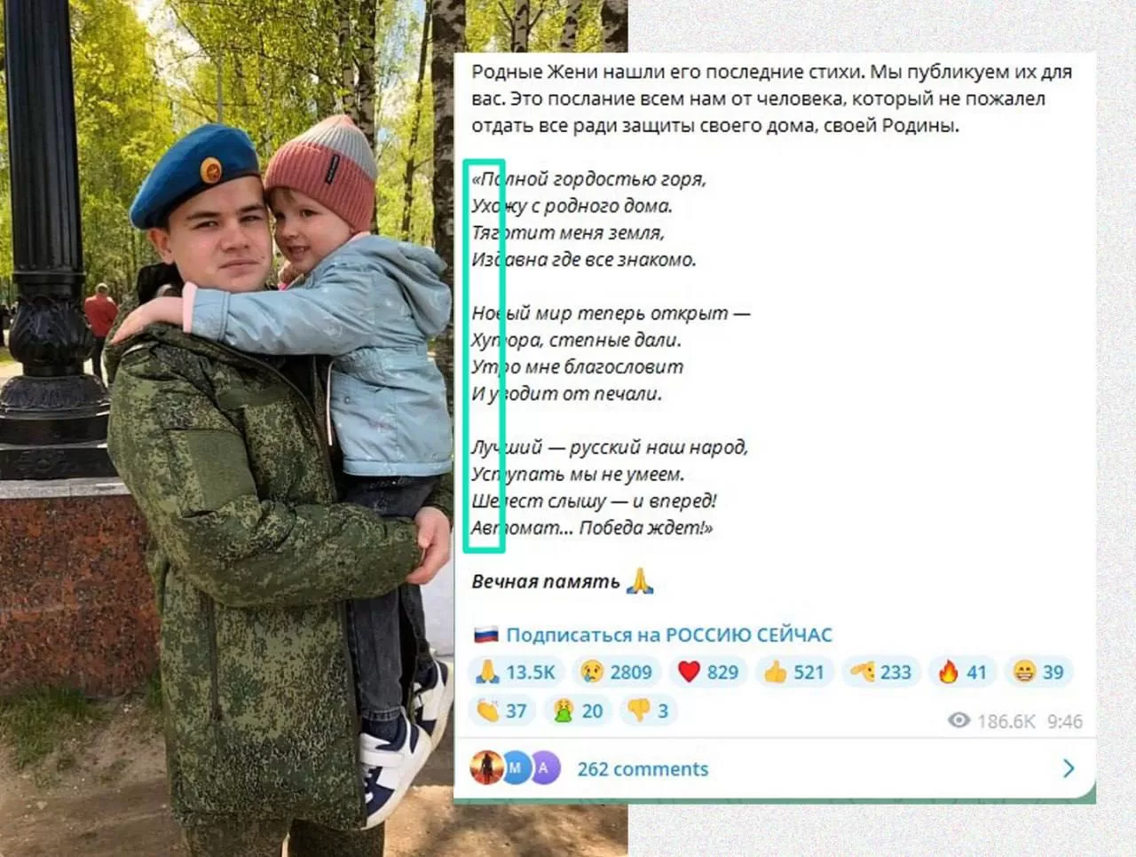 Один из Z-каналов опубликовал стихотворение погибшего 19-летнего «героя СВО», которое передали паблику родные военного.