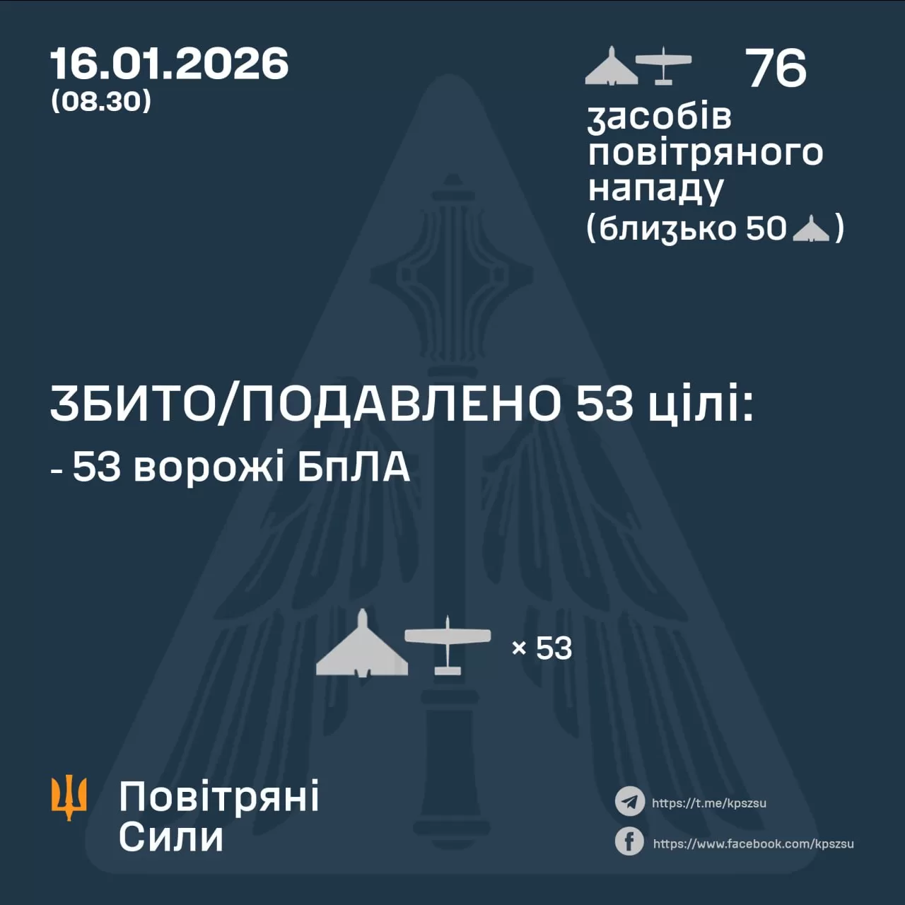 В ночь на 16 января, начиная с 18:00 15 января, РФ атаковала Украину 76 ударными БпЛА типа Shahed, в том числе реактивными, «Гербера», «Италмас» и беспилотниками других типов с направлений: Курск, Орел, Приморско-Ахтарск, ТОТ Донецк. Около 50 из них – «шахеды».
