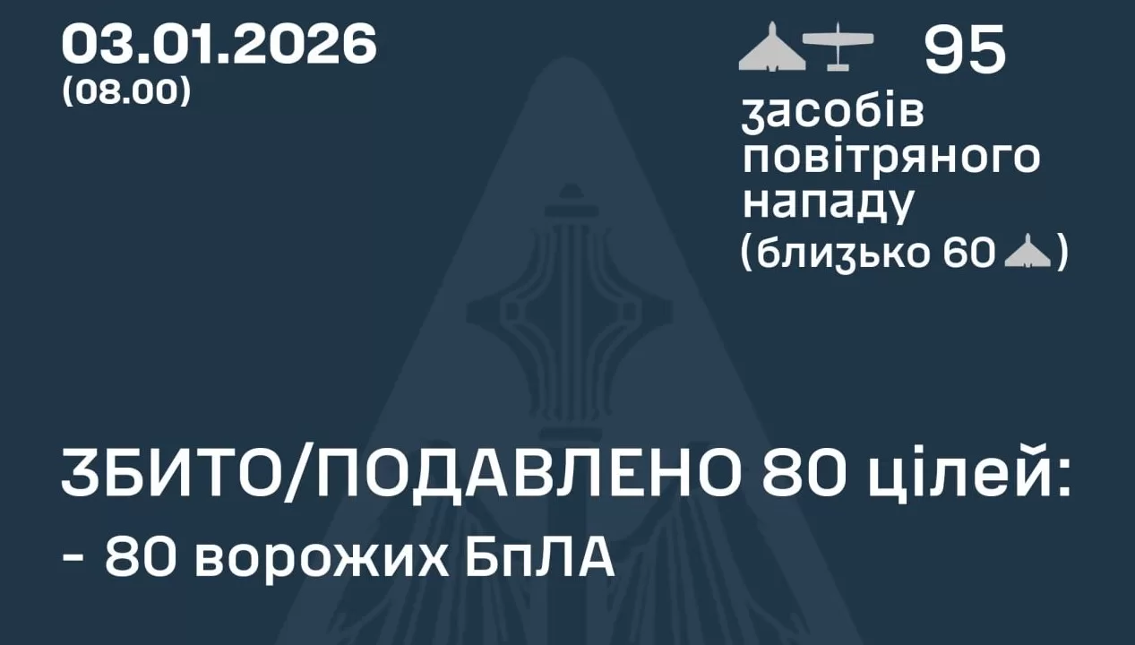 В ночь на 3 января российские войска атаковали Украину 95 ударными беспилотниками различных типов, в том числе Shahed и «Гербера». Силы противовоздушной обороны сбили и подавили 80 вражеских БпЛА.