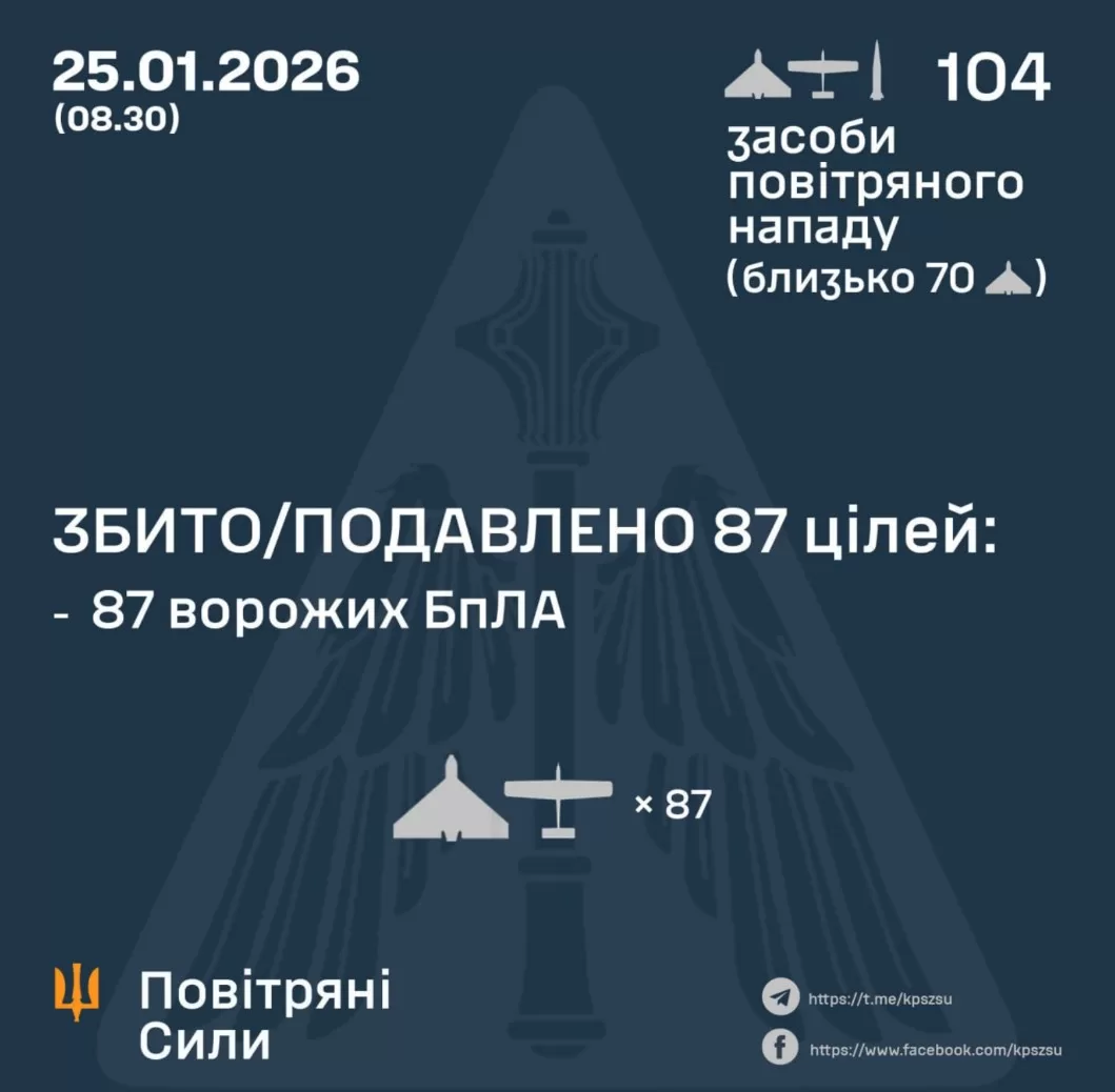В ночь на 25 января россия осуществила массированную воздушную атаку на Украину с применением дронов и ракет. Силы противовоздушной обороны уничтожили и подавили большинство вражеских беспилотников.