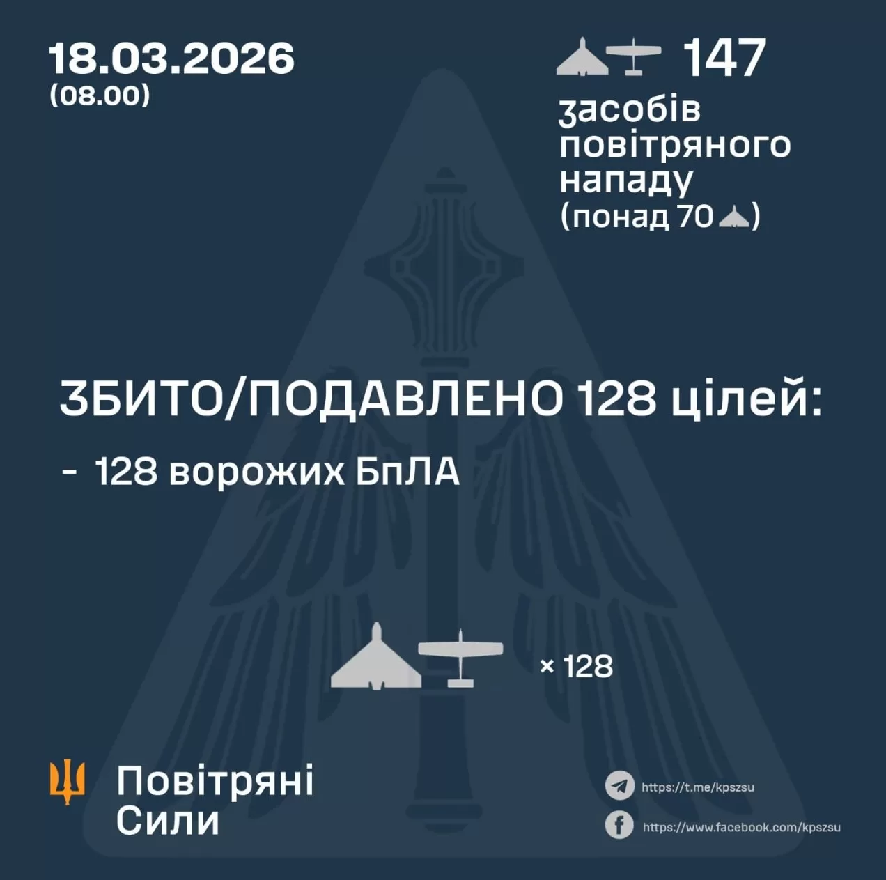 В ночь на 18 марта российские войска атаковали Украину 147 ударными беспилотниками различных типов. Силы противовоздушной обороны сбили или подавили 128 из них, однако зафиксированы и попадания.