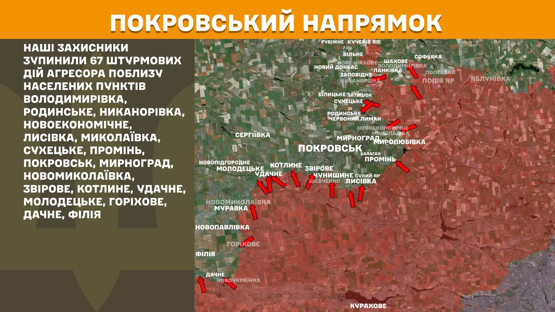 На Покровском направлении украинские защитники остановили 67 штурмовых действий агрессора вблизи населенных пунктов Владимировка, Родинское, Никаноровка, Новоэкономичное, Лесовка, Николаевка, Сухецкое, Проминь, Покровск, Мирноград, Новониколаевка, Зверовое, Котлино, Удачное, Молодецкое, Гореховое, Дачное, Филия.