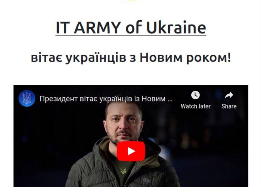 IT-армия Украины разместила на сайтах нескольких городов РФ поздравление с Новым годом от президента Украины Владимира Зеленского.