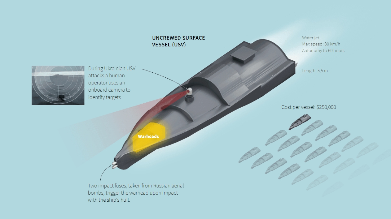 «Способность морских беспилотников нести больше взрывчатки и наносить удары по ватерлинии кораблей делает их более опасными, чем ракеты и бомбы. Относительно низкая стоимость беспилотников также позволяет Украине проводить атаки в большом количестве», — говорится в материале.