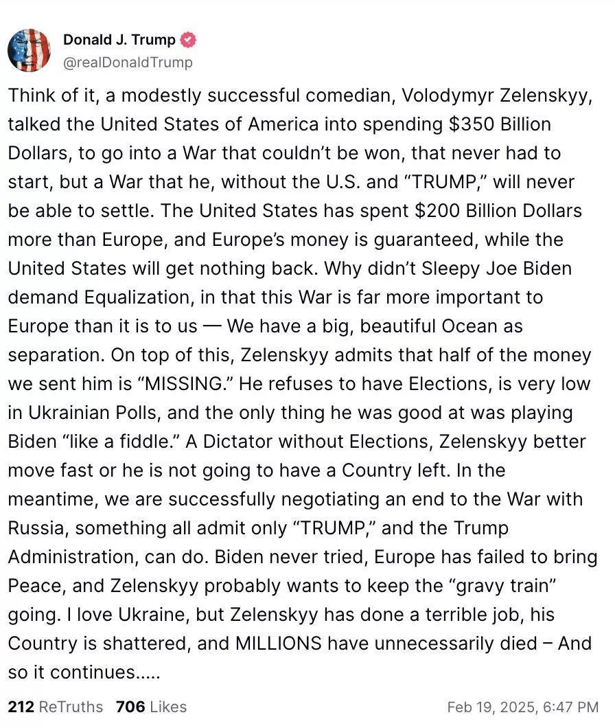 «Подумайте только: комик Владимир Зеленский со скромным успехом убедил США потратить 350 миллиардов долларов на войну, которую нельзя было выиграть, которая никогда не должна была начаться, но которую он без США и Трампа никогда не сможет урегулировать», – написал Трамп.