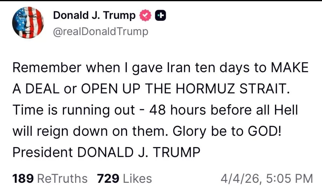«Помните, когда я дал Ирану десять дней, чтобы заключить сделку или открыть Ормузский пролив? Время истекает — через 48 часов на них обрушится ад», — написал президент США в своей соцсети Truth.