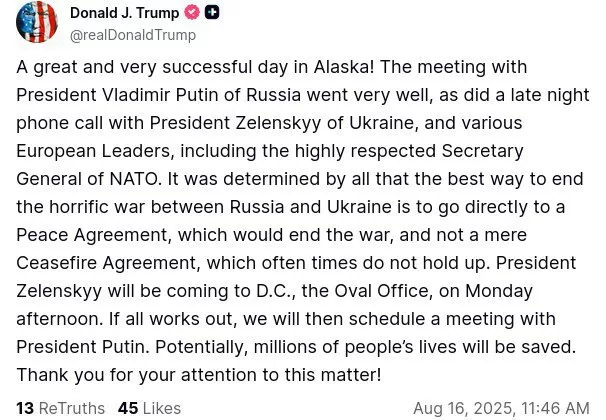 Президент США Дональд Трамп сообщил в своей соцсети Truth об итогах встречи с президентом России Владимиром Путиным, которая состоялась на Аляске. По его словам, переговоры прошли успешно, а впоследствии он также провел телефонный разговор с президентом Украины Владимиром Зеленским и несколькими европейскими лидерами, включая генсека НАТО.