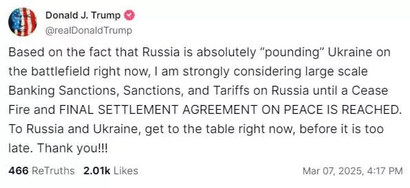 «Учитывая тот факт, что Россия сейчас буквально «лупит» по Украине на поле боя, я серьезно рассматриваю возможность введения масштабных банковских санкций, санкций и тарифов в отношении России до тех пор, пока не будет достигнуто прекращение огня и финальное соглашение о мире», – заявил Трамп.