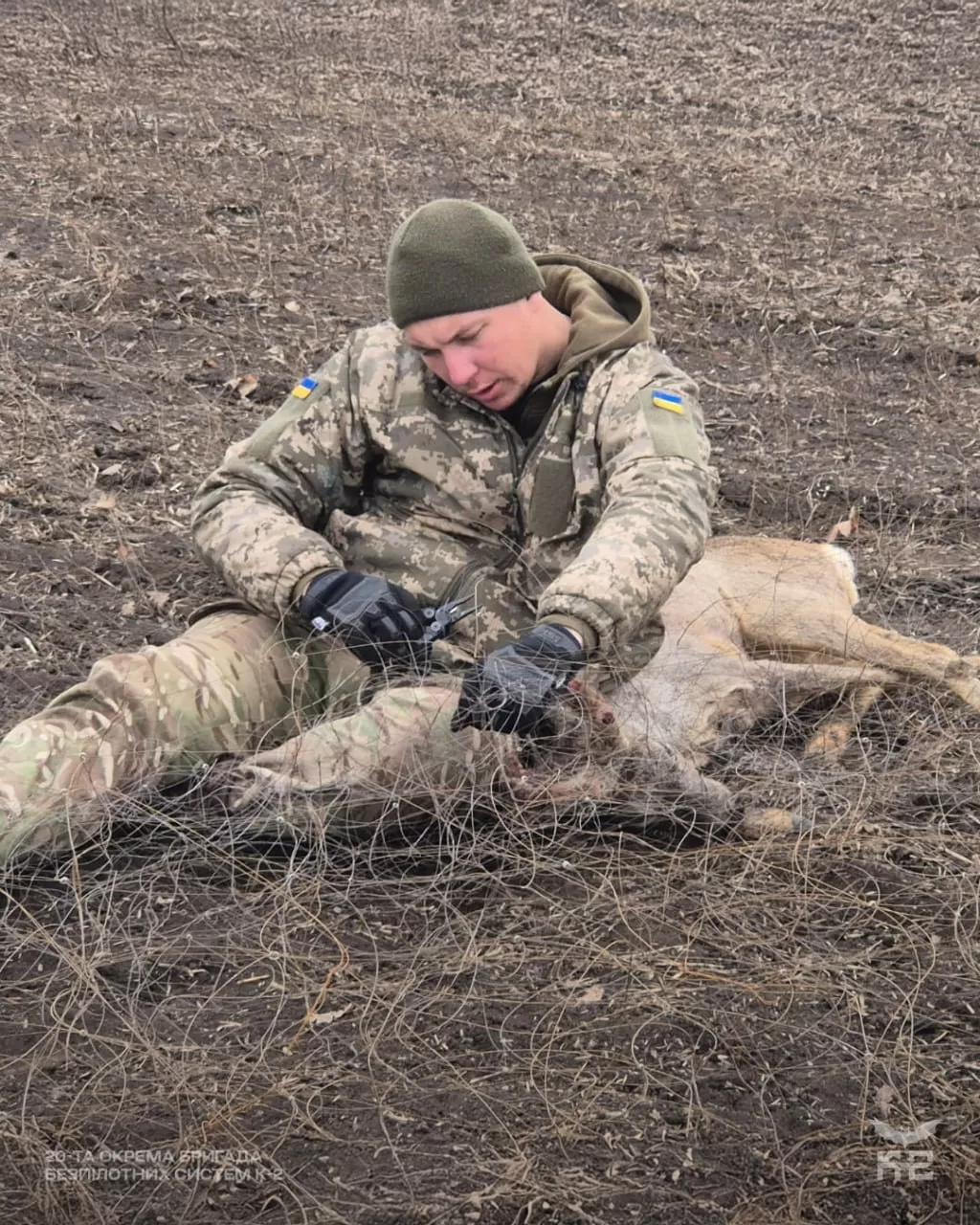 Как отмечается, один из военных с позывным Грунь заметил движение в сухой траве. Там обнаружили трёх косуль, которые намертво запутались в проволочной ловушке.