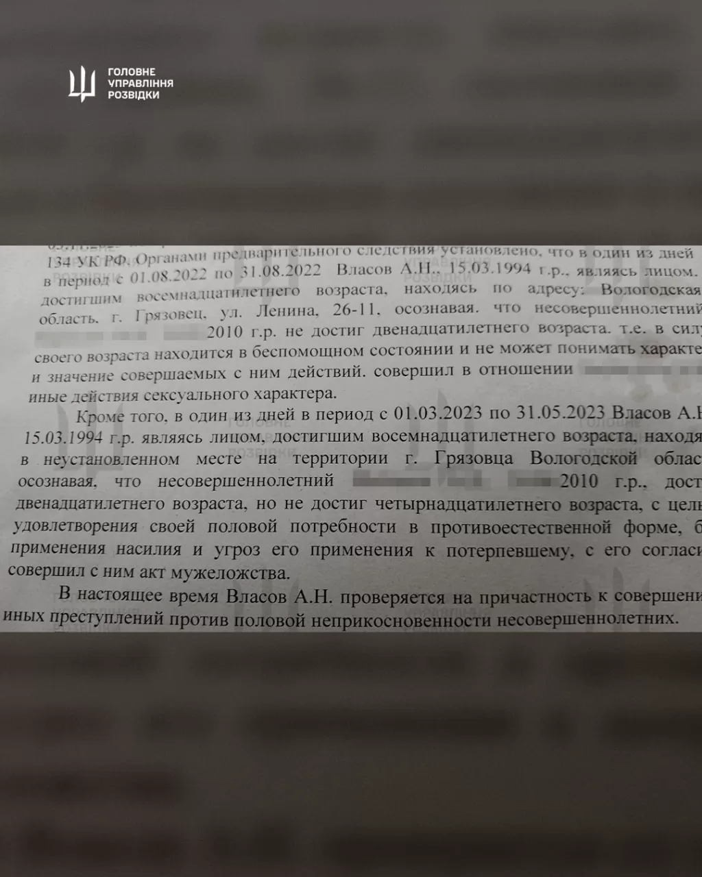 «В 2022–2023 годах Власов совершил насильственные действия в отношении двух мальчиков 2010 года рождения, воспользовавшись их беспомощностью – жертвам на момент преступления было 11–12 лет», – рассказали в ГУР.