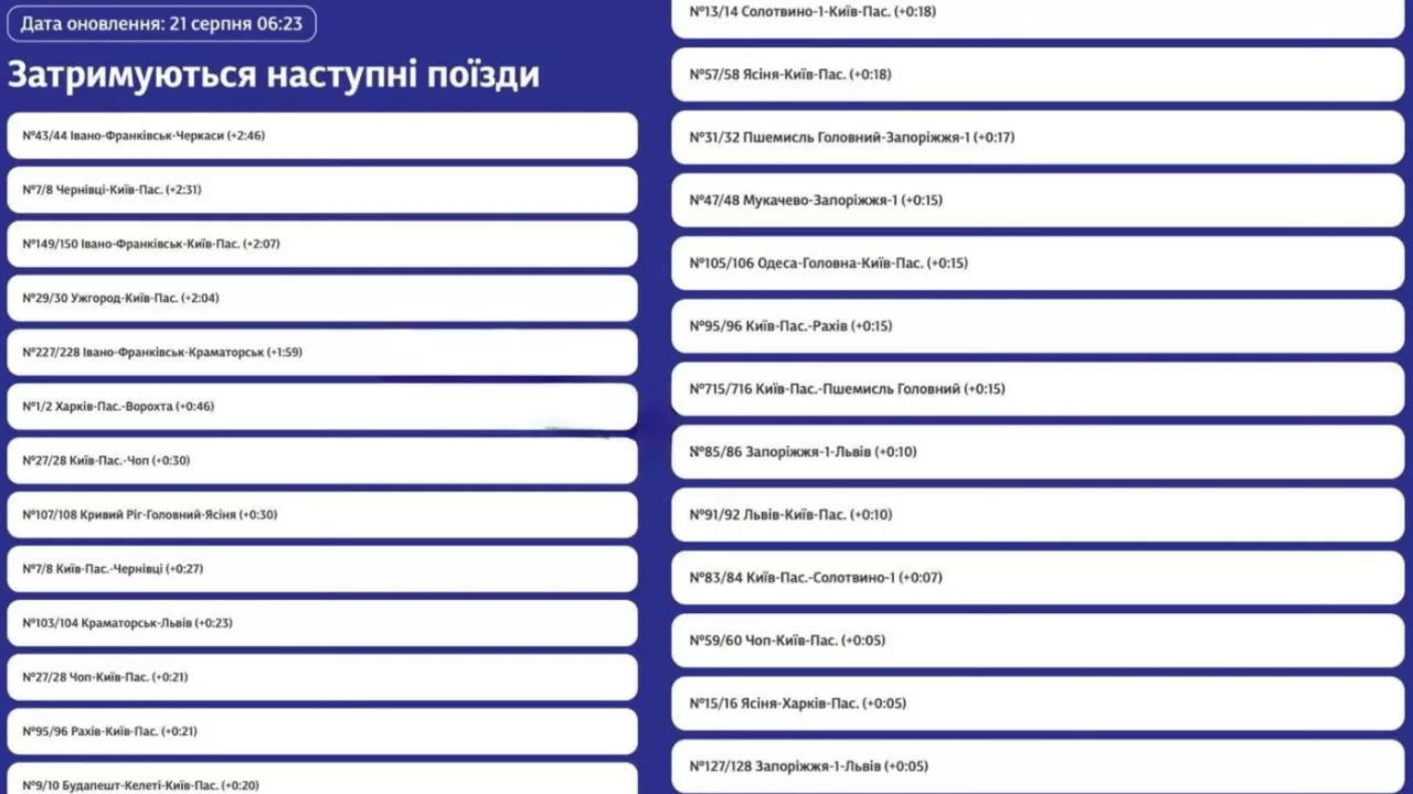 Как сообщили в «Укрзализныце», опаздывают рейсы из Ивано-Франковска, Черновцов, Ужгорода, Харькова, Кривого Рога, Одессы и других городов.