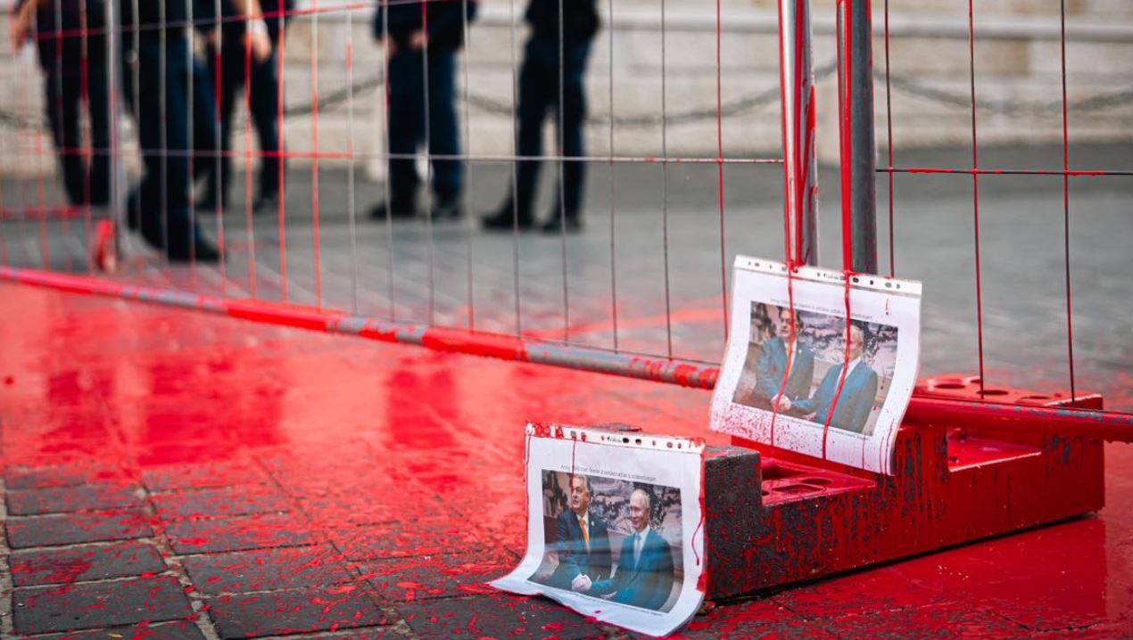 В понедельник четыре парламентария от оппозиционной фракции «Моментум» облили забор вокруг кабинета венгерского премьера Виктора Орбана краской цвета крови.