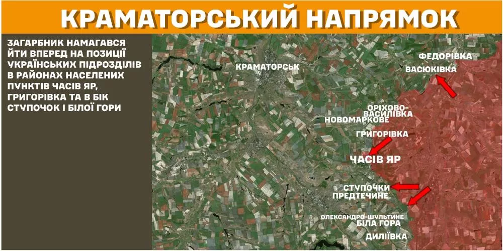 На Краматорском направлении захватчик пытался идти вперед на позиции украинских подразделений в районах населенных пунктов Часов Яр, Григорьевка и в сторону Ступочек и Белой Горы.