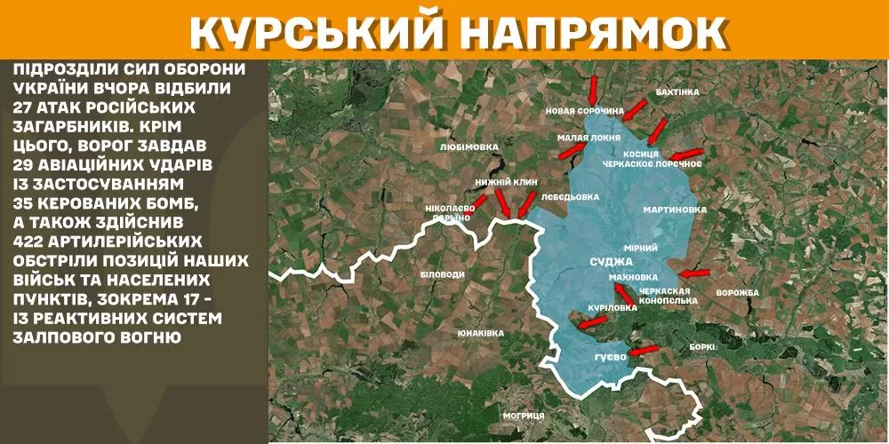 В операционной зоне на Курщине подразделения Сил обороны Украины вчера отбили 27 атак российских захватчиков. Кроме этого, враг нанес 29 авиационных ударов с применением 35 управляемых бомб, а также осуществил 422 артиллерийских обстрела позиций ВСУ и населенных пунктов, в том числе 17 – из реактивных систем залпового огня.