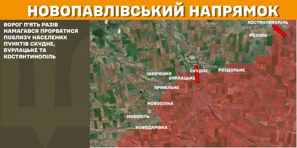 На Новопавловском направлении враг пять раз пытался прорваться вблизи населенных пунктов Скудное, Бурлацкое и Константинополь.