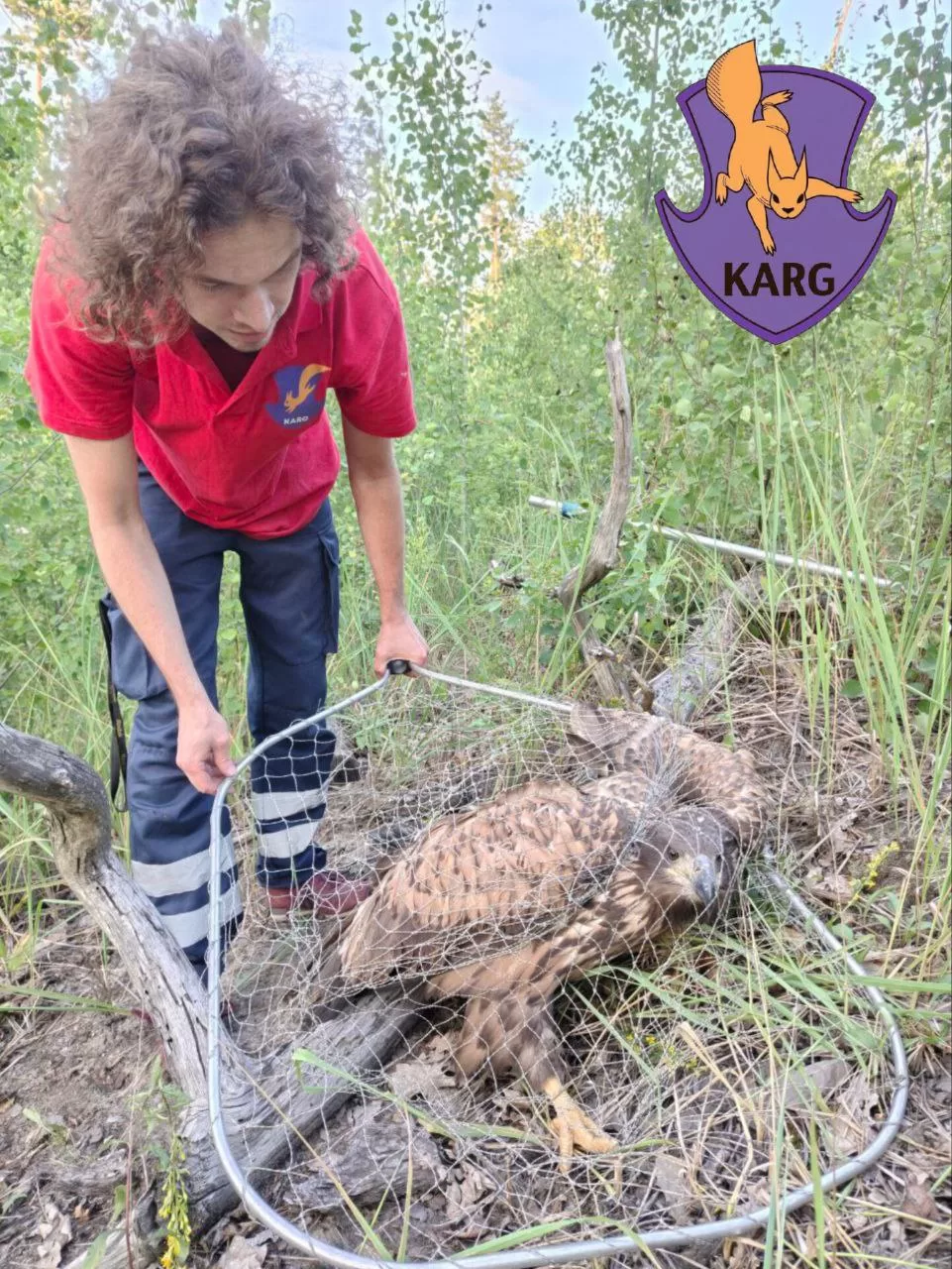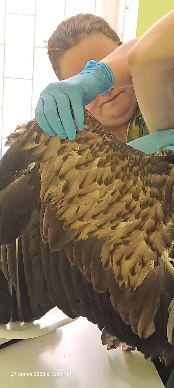 Птицу нашли в Обуховском районе — двое парней заметили ее во время пробежки. Орлан был дезориентирован и не мог подняться в воздух. Парни вызвали на место спасателей и договорились с «Садибою Нюшанік» о приюте.