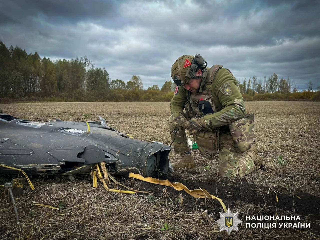 После осмотра беспилотного летательного аппарата взрывотехники полиции на месте провели обезвреживание его 50-килограммовой осколочно-фугасно-зажигательной боевой части.