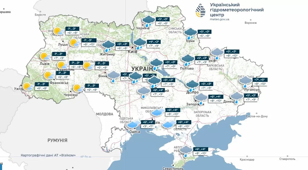 По прогнозу Укргидрометцентра, умеренные дожди ожидаются в большинстве областей, кроме западных. Ночью местами возможен мокрый снег, а на юге и востоке страны — лишь небольшой дождь.