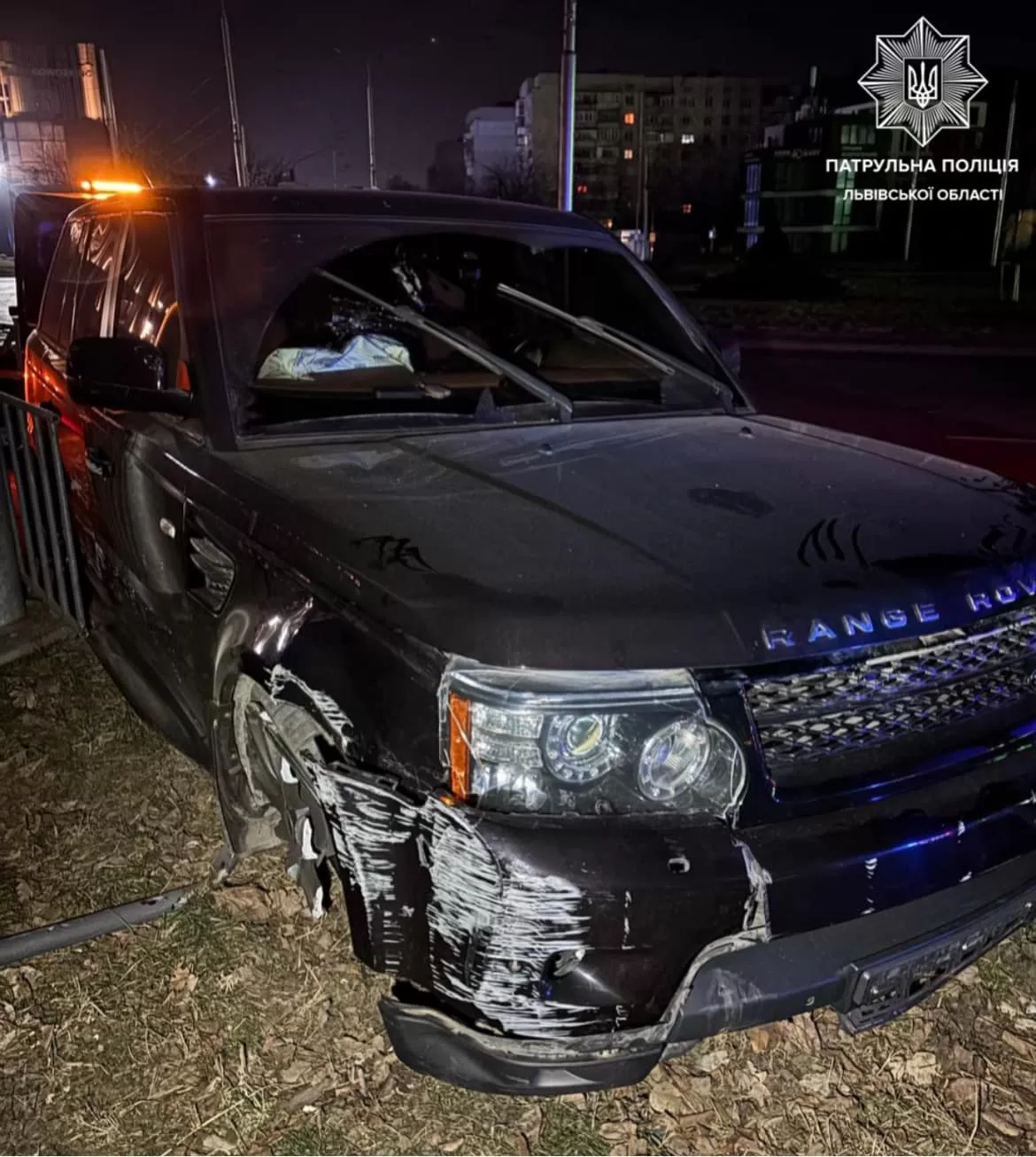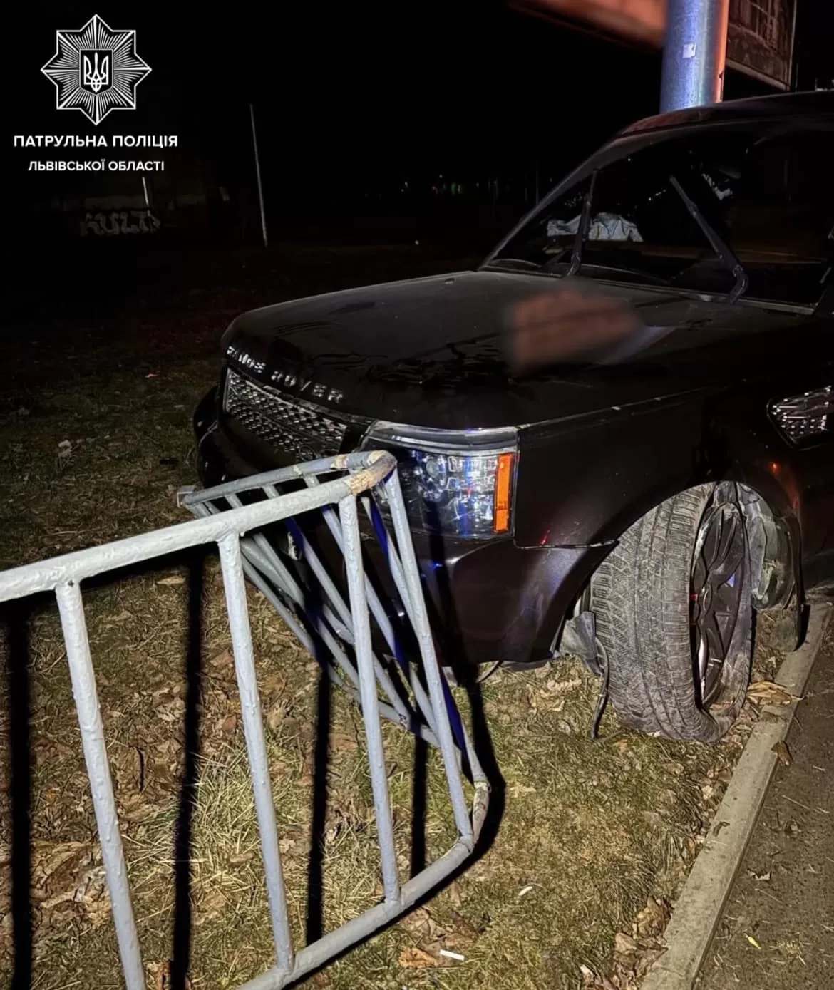 Ночью 26 февраля во Львове на перекрестке улиц Кульпарковской и Владимира Великого внедорожник Range Rover врезался в тротуарное ограждение – металлический забор.