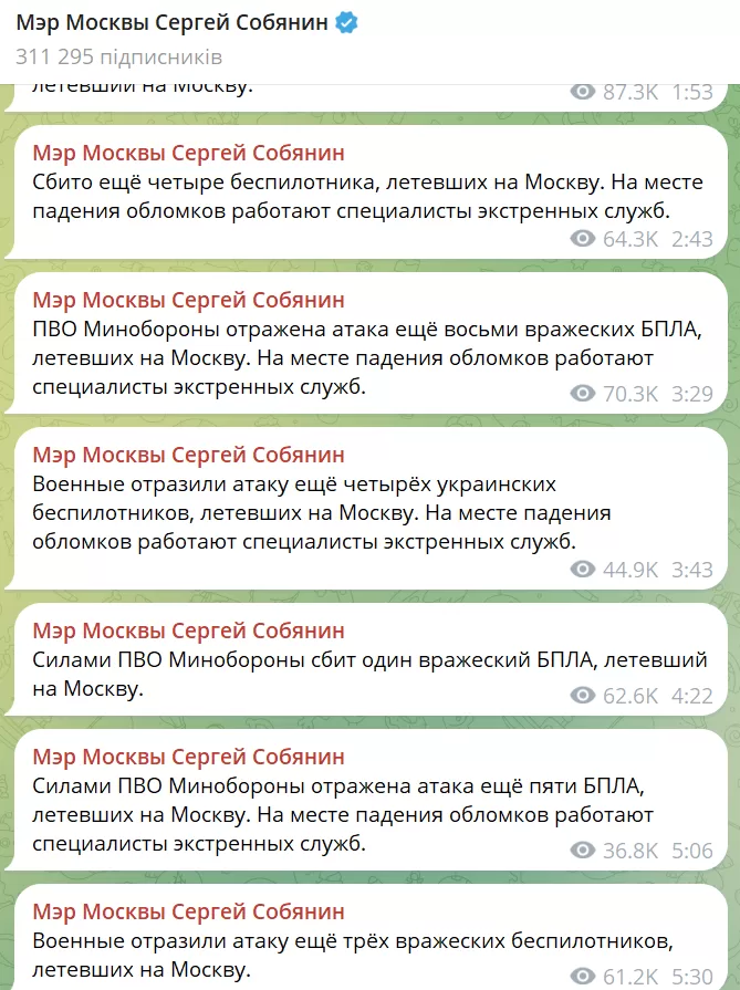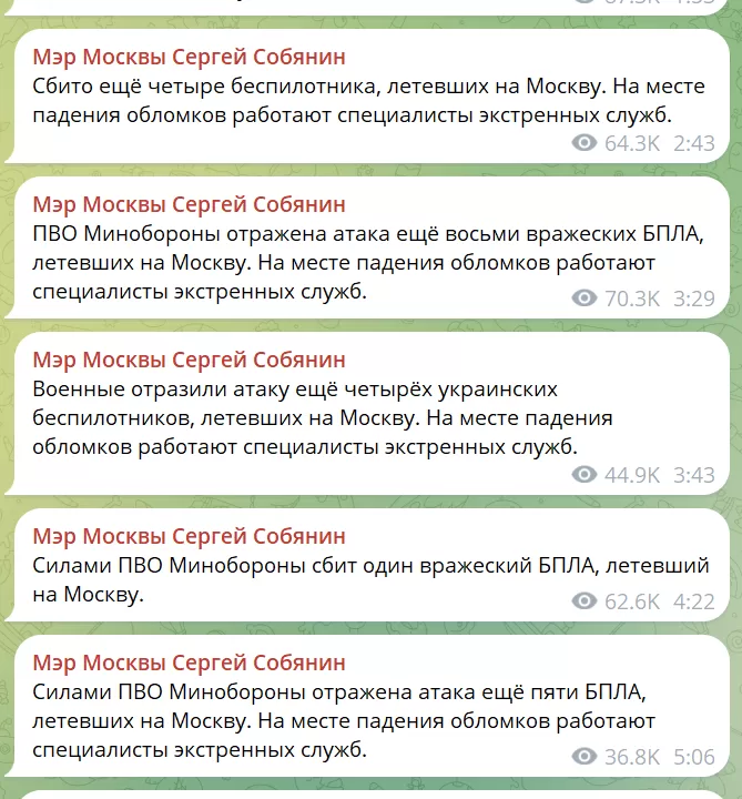 Как сообщил мэр Москвы Сергей Собянин, ПВО отразила атаку более десяти украинских беспилотников, летевших на Москву.