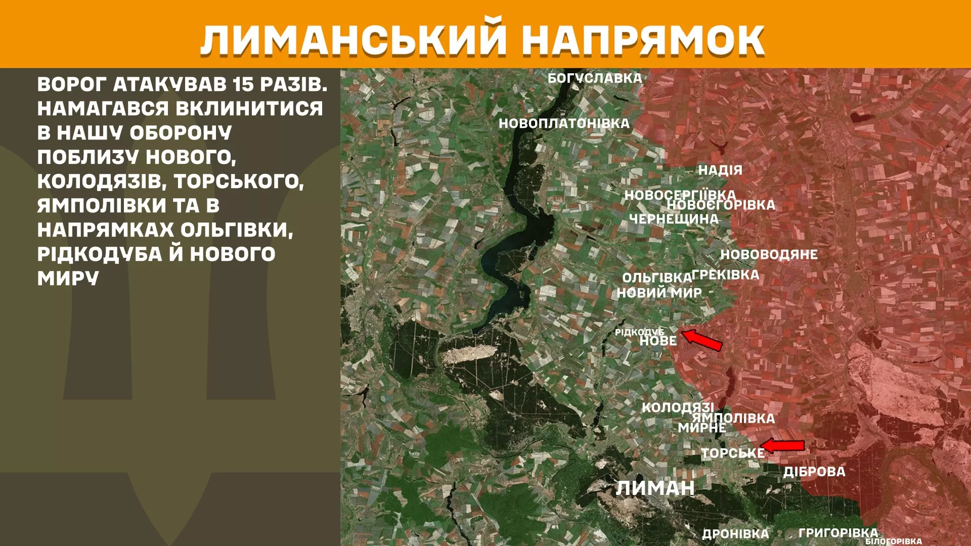 На Лиманском направлении враг атаковал 15 раз. Пытался вклиниться в оборону ВСУ вблизи Нового, Колодязов, Торского, Ямполевки и в направлениях Ольговки, Редкодуба и Нового Мира.