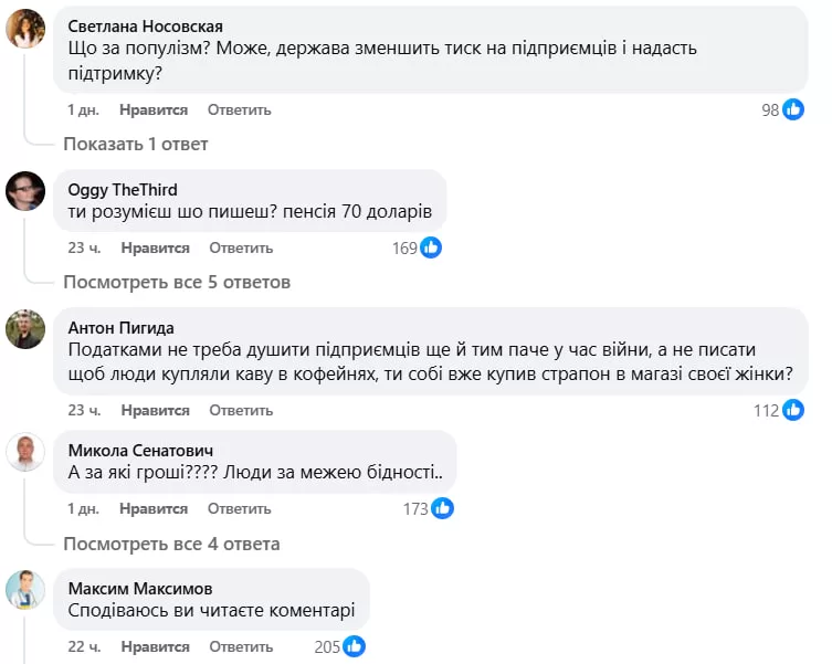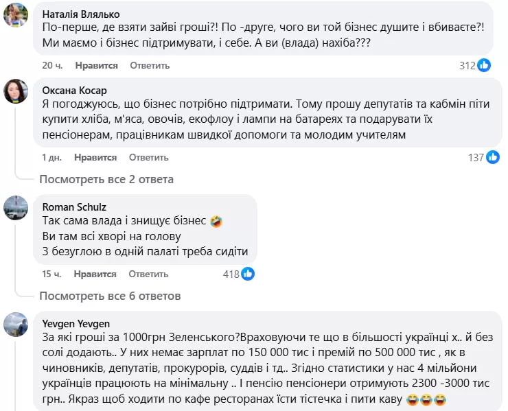 В комментариях пользователи в основном ставили под сомнение возможность такой поддержки в нынешних условиях. Люди пишут о нехватке средств, низких зарплатах и пенсиях, росте цен, налоговом давлении на предпринимателей и отключении света и тепла, отмечая, что для многих даже базовые потребности стали сложными для обеспечения.